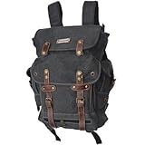 Heavy-duty canvas backpack sports faux leather straps with brass snap closures for quick access.